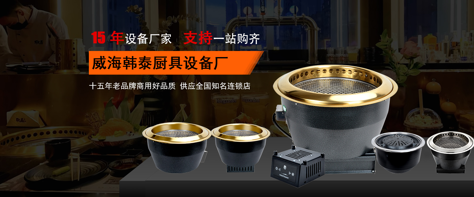 韓泰(HNTAI)廚具品牌是擁有15年歷史的生產(chǎn)廠家,成立于2009年,公司位于美麗的海濱城市威海市高區(qū),是圍繞燒烤爐系列產(chǎn)品集研發(fā)、制造、銷售、售后于一體的綜合性生產(chǎn)企業(yè),主營產(chǎn)品無煙燒烤爐,日式電烤爐,烤涮一體爐,韓式商用爐等,我們給國內(nèi)很多品牌連鎖店提供廚具設(shè)備,吉布魯,韓宮宴、酒拾烤肉、歡樂牧場,八幡無二、九田,本家,雅麗家,韓風(fēng)源自助連鎖,小尾羊,炙景臺燒肉,楊記齊齊哈爾烤肉等等。產(chǎn)品遠(yuǎn)銷韓國、新西蘭、西班牙、維也納、美國等其他國家和地區(qū),期待您選擇韓泰,我們將竭誠為您服務(wù)!